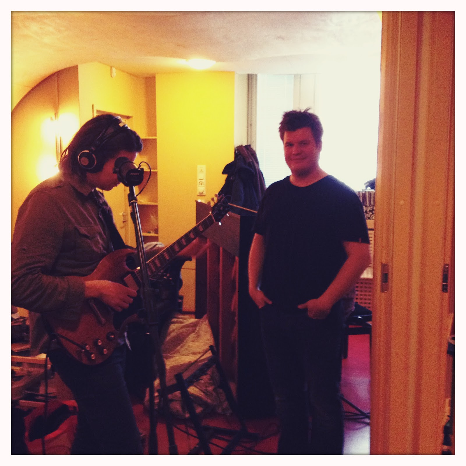 The drum kit was miked with an AKG D112 and DIY Subkick on the kick, SM57 top (with my DIY hi-hat spill guard "Moltonkirves") and bottom of the snare, Line Audio CM3's on the toms and for overheads we used vintage Neumann CMV-563's with recently reskinned and stereo matched M7 capsules (which sound amazing, BTW - reskinning was done by Thiersch Elektroakustik in Germany). The ambience mics were a pair of 'affordable' (=dirt cheap) Thomann ribbon mics, the RB-100's (highly recommended "my-first-ribbon"-mic!). They were placed behind the kit with nulls pointing at the sound source. The reason is that we placed Olli and his drums so close to the window in order for him to see, so there was little space in front of the kit. They worked like a charm behind the kit too (though they didn't make it to the final mix). There was no need for a hihat mic so we didn't put one. The less, the merrier. Olli's vocals were miked with a SM58.
